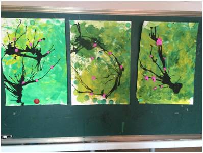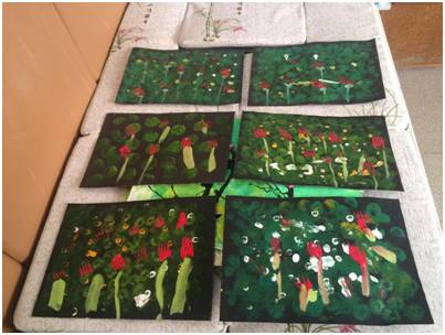 第三节课,创设自己的花园,用拓印工具海绵树叶,叉子印花,手指点画花完成。