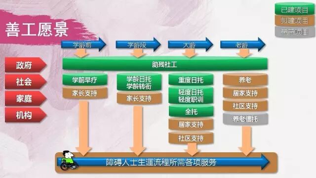 每个智力及发展性障碍人士的一生,都将经历嗷嗷待哺的婴幼儿期,天真活泼的儿童期,身体茁壮成长的青年期,无忧无虑的成年期,也难以避免面对岁月留下痕迹的老年期。怎么让一直如孩子一样纯净的他们,这一生每一个阶段,都有应有的精彩,都能够得到属于自己的快乐,让他们能够有尊严且有品质的生活。这是善工一路的宗旨,也是善工承载的使命。